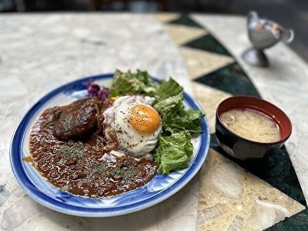 ハワイを代表する名物料理「ロコモコ」(1350円)、たまごの半熟度もお気に入り、ハンバーグもソースも、とてもおいしいです。 全て自家製です。ロコモコのハンバーグソースはデミグラスソースで、牛肉、セロリ、玉ねぎ、人参などの野菜を赤ワインとフォンドヴォーでじっくり煮込んで作られています。 サラダには胡桃が散らされ、食感も楽しめます。 ご飯の量は180gで、小盛りや大盛りも可能。大盛りはプラス150円です。 他のランチメニューは、トルコライス、スパイスカレー、タコライス、オムライスがあります。ちなみに、夜メニューは18時~22時まで提供されます。