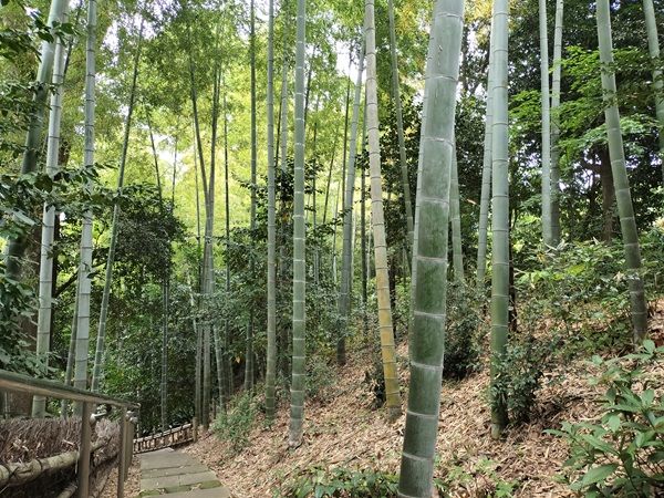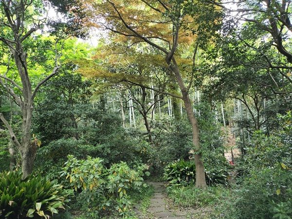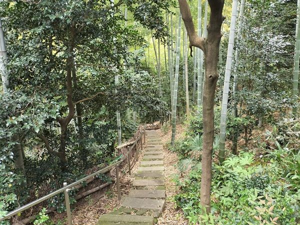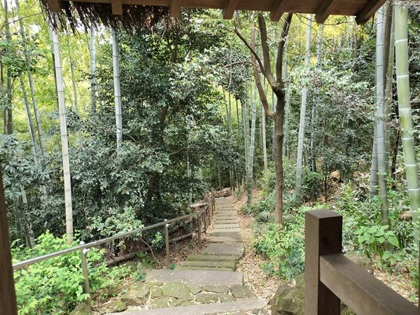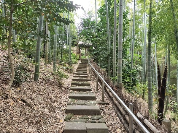 入り口の門をくぐると、深い森へと導くような長い階段が見えて来ました。小径の周りは竹林と雑木林が続いています。