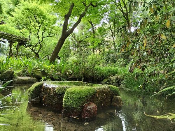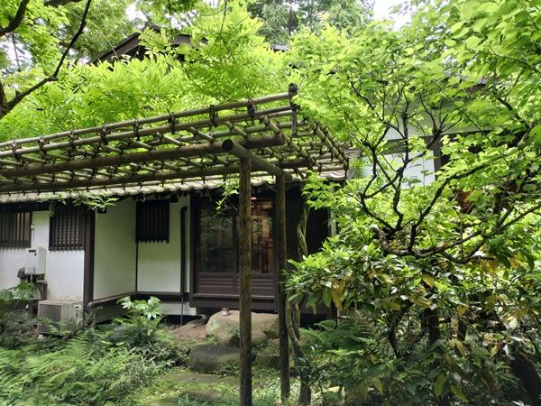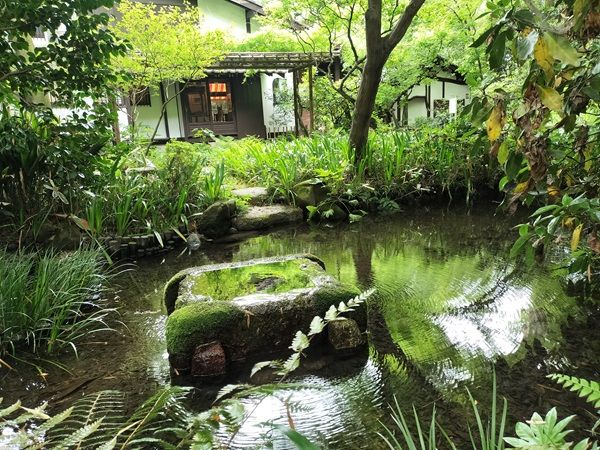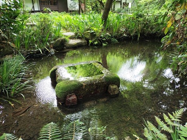 中庭には湧水の池がありました。東京都名湧水57選に選ばれた湧水です。水面に映る緑が美しく輝いていました。