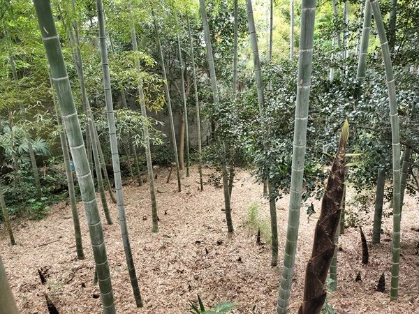 森の中ではたくさんの種類の動植物が見られます。竹林の小径の先で、こちらを見ている動物と目が合いました。それはなんと…たぬきでした。写真に収めようと慌ててカメラを向けましたが、残念ながら逃げられてしまいました。