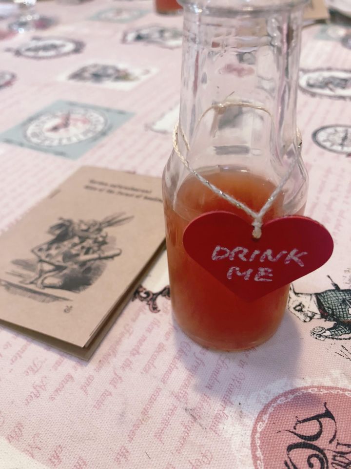 食前のサービスとして、アリスがお話の中で飲んで小さくなる「Drink Me」と書かれたいちご味の飲み物を頂きました。