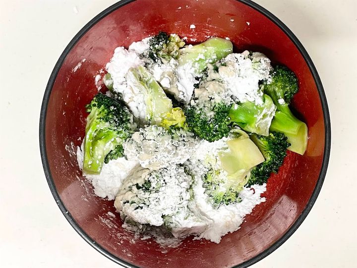 2.水気を軽く切って片栗粉に加え、ブロッコリー全体にしっかりとまぶします。
