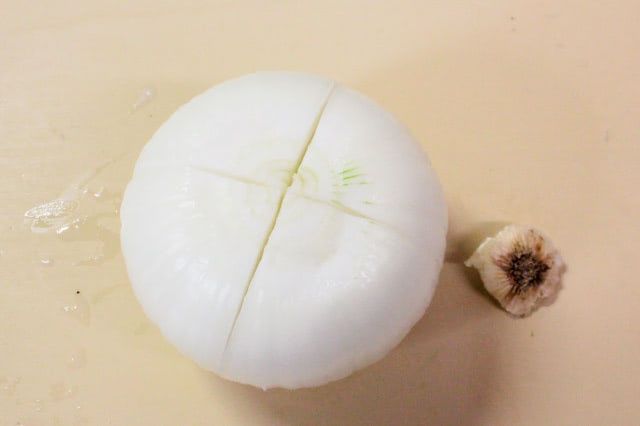 1. 新玉ねぎのお尻と上部を取り除き、深さ半分くらいまで十字に切り込みを入れます。