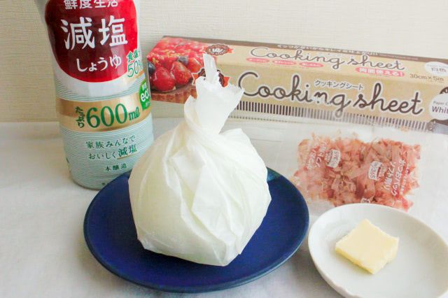 レンジ500Wで5分加熱すると若干食感が残っておいしいそうです。加熱が終わったら完成です♪バター、しょうゆ、かつお節をトッピングします。