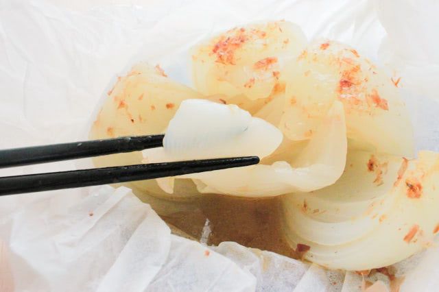 バター、しょうゆ、かつお節を乗せると、バターがすぐに溶けて新玉ねぎの間にスルッと入り込みました。