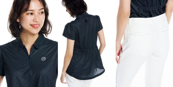 〈左〉高級感のあるモノグラムで大人っぽい装いに。生地と同色のジップアップで首周りがスッキリ見えます。〈中〉ヒップをカバーするうれしいチュニック丈。ウエスト周りのギャザーと程よい透け感で後ろ姿も女性らしい。〈右〉ストレッチ性に優れたパンツは、ヒップ周りのシルエットも美しい。スコアカードが出し入れしやすいポケットも◎