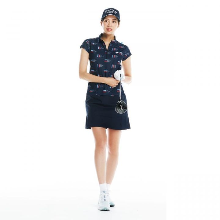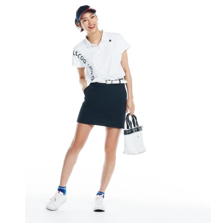 好感度の高い白×ネイビーのコーディネート。右側に配したブランドネームがシンプルなデザインに引き立ち、チビ襟やドルマンスリーブで今っぽいシルエットに。さらっとした肌ざわりが快適なネイビーのスカートは、裾にドットのロゴがプリントされ、スポーティに着こなせます。