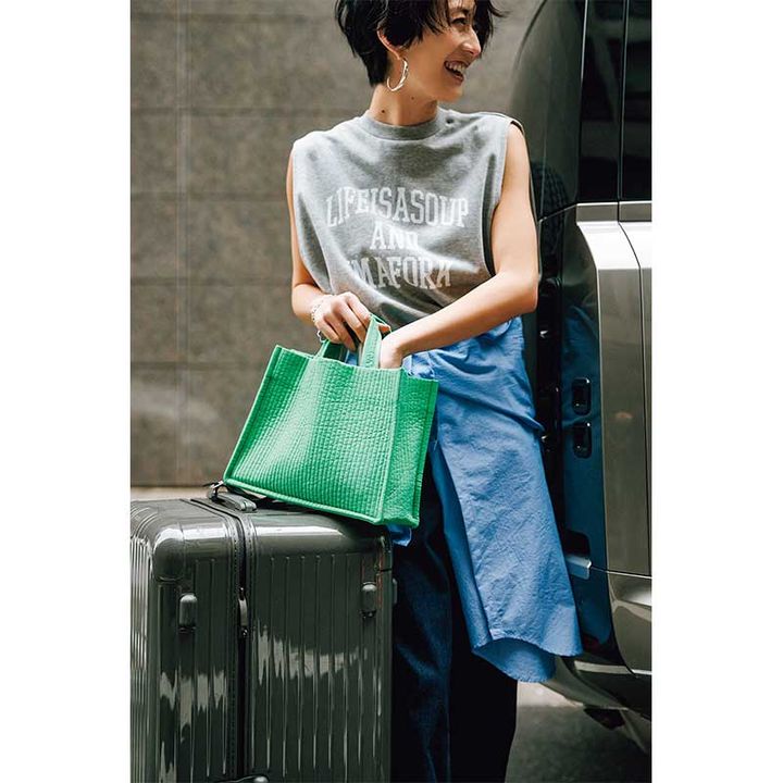 ピオヌンナル史上最小のヒロインバッグ。つい地味な色の服を選びがちな旅には、インパクトのあるミニバッグがポイントに。内側のストライプも可愛い♡ インソールがあるのも便利です。バッグ〈H21×W28×D11cm〉¥25,080(pionunnal)トップス¥14,300(マイカ アンド ディール/マイカ アンド ディール 恵比寿店)腰に巻いたシャツ¥25,300(アルページュストーリー/アルページュストーリー プレスルーム)デニムパンツ¥17,600(カデュネ/カデュネ プレスルーム)ピアス¥32,000ブレスレット¥28,800(ともにヨア)