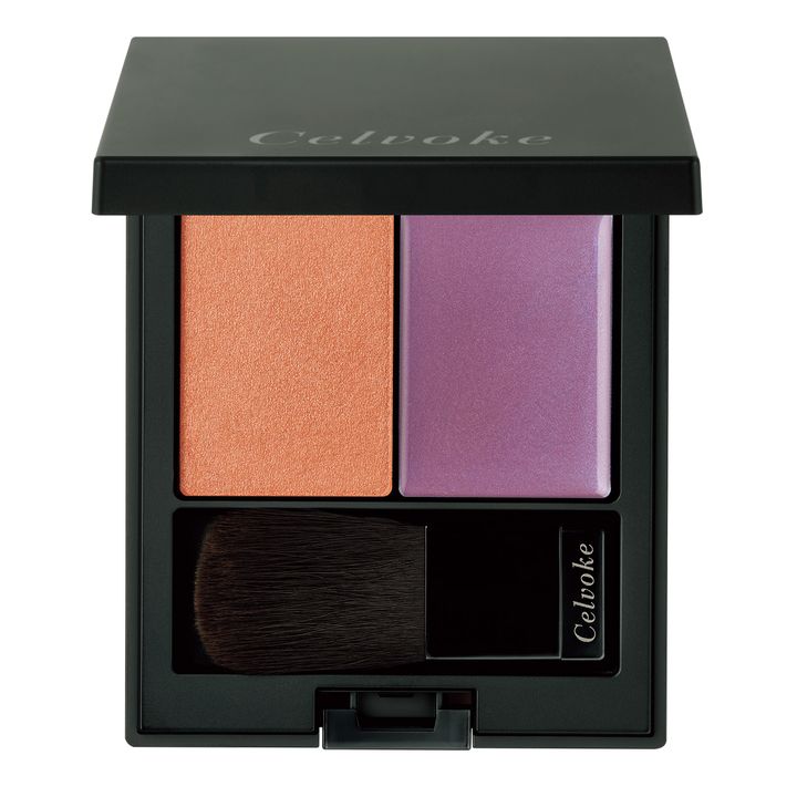 「しっとりパウダーが肌と一体化、繊細パールのクリームを重ねると立体フェイスに。毛穴落ちもなし」異なる2種の質感で自然な立体感が。¥5,390(Celvoke)