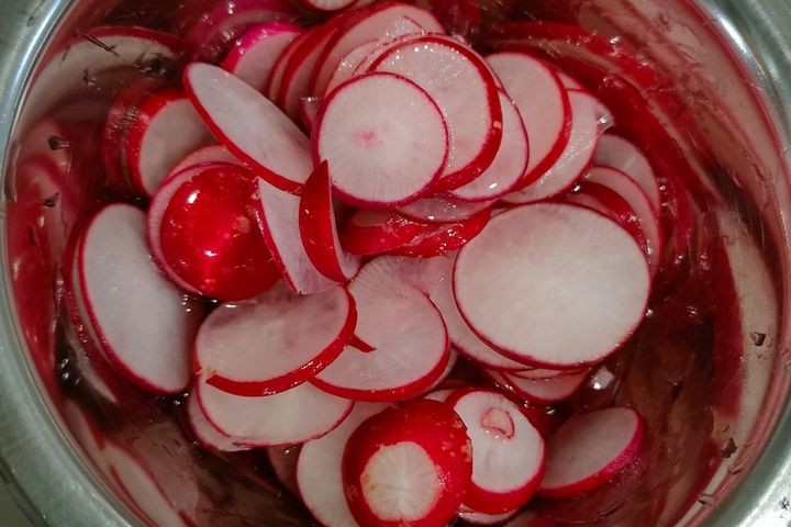 ラディッシュの根の部分をよく洗って薄くスライスして、甘酢に漬けるだけです。