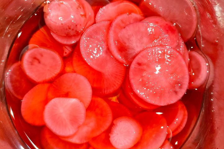 ラディッシュに含まれるアントシアニンとお酢が反応して、赤色になります。
