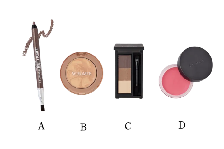 Bは指で目頭のくぼみにのせ、Dを唇に指でオーバーめに2~3回重ね塗り。眉は、Cの中央と下段の2色を混ぜてふわっとのせ、アイラインとトーンをそろえる。