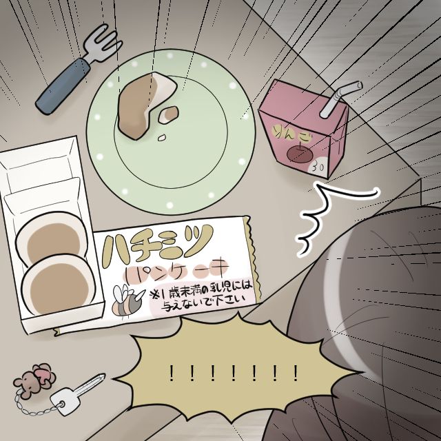 そして迎えた義母の誕生日当日、「パパママいってらっしゃーい!」と義母に笑顔で送り出され、不安いっぱいのユリさん、3時間ってこんなに長いの!?といつもとり時間の経過が遅いと感じつつ、急いでゆうくんに会いに戻ったところ、何気なく目をやったテーブルに1歳未満は摂取不可能なハチミツを使ったパンケーキを食べた後が・・