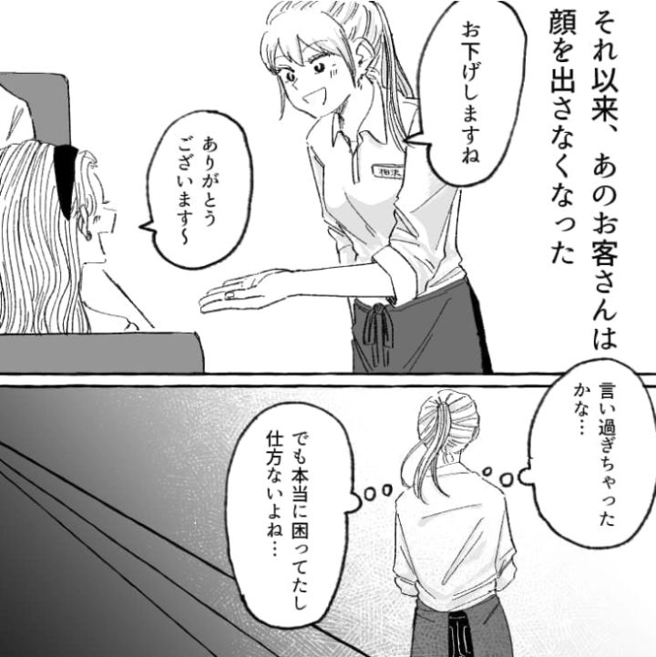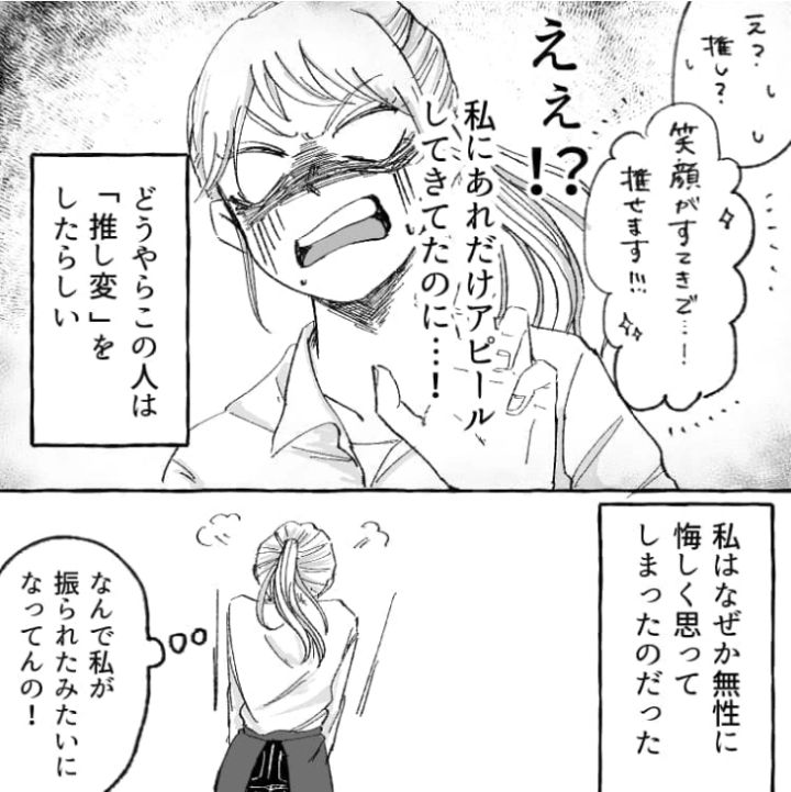 この前までの熱意はどこへやら、急に別のスタッフに”推し変”したお客さん。あんなに困っていたのに、いざ推し変され悔しい気持ちになってしまったようです。接客をしていると、さまざまなお客さんに出会うものですが、お客さんがどんな反応をしてきたとしても、あまり気にし過ぎないほうが良いのかもしれません・・・。