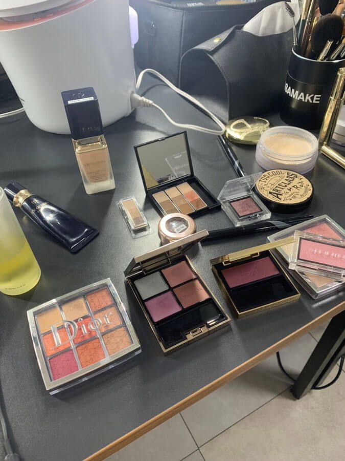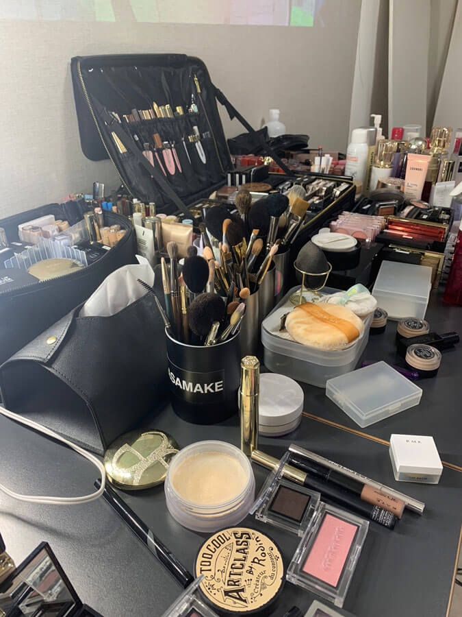 現場には溢れんばかりのコスメが……! プチプラからデパコスまで、幅広くそろっています。メイクをしていただきながら「最近佐々木さんが推しているコスメはなんですか?」「ブルベ夏でも大丈夫なオレンジコスメはなんですか?」などのコスメ情報もうかがいました♪ 魅力的なコスメが多すぎて、レッスン後にどれを購入するかすごく迷っちゃいました……!