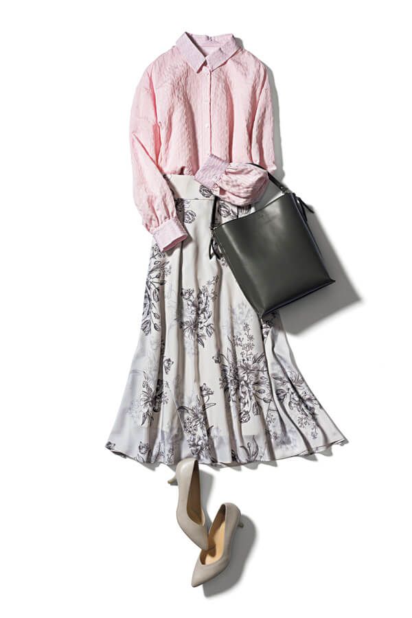 注目トレンドのシャツを大好きなピンクで投入すれば、きちんと感も親しみやすい印象も手に入っていいことづくめ! 通勤コーデに大活躍です。