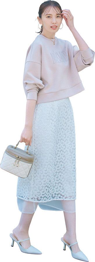 ラフさが魅力のスウェットトップスには、繊細な刺しゅうやチュールで仕立てたロマンティックなスカートで甘さを足すくらいが◎。コンパクトな丈感を選べば、カジュアルになりすぎず、ほどよくフェミニンに。ピンク×オフホワイトのおなじみニュアンス配色も、テンションの違う素材同士を合わせることで おしゃれ度が格段にUP!