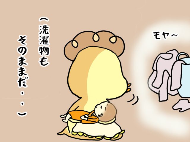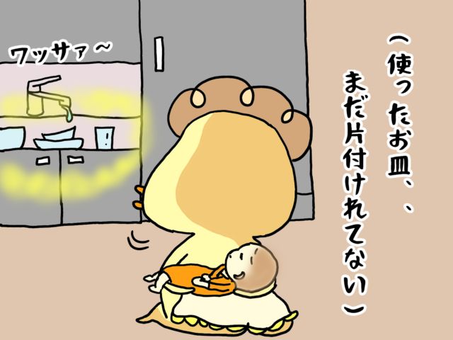ご主人と話したい!少しでもゆっくりしたい!と思いながらも、赤ちゃんを見てもらっている間に用事をこなしたい!と大急ぎで家事をこなすてる子さん、やっと一息・・と思った時には日付が変わっていて、明日も仕事に行くご主人に無理はさせられない、と抱っこを代わり、まともに話もできないまま、またしても2人だけの夜を過ごすことに・・