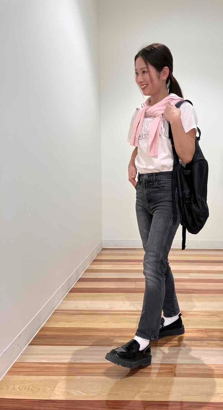 「遠足なので両手が空くことがマストだと思い、まずはリュックを探すところからスタート。使わないときは収納に困らないよう小さく折り畳めるのが理想だったのですが、なんとファミマで約2000円のものを発見!うれしくて即購入しました。砂場などを歩くことがなかったので、スニーカーにこだわらず、全体的にカジュアルなコーデだったので園の雰囲気に合わせてキレイめローファーに。レジャーシートに座ったりするときに簡単に着脱もできて一石二鳥でした」小林千尋さん/主婦(2歳と4歳女の子ママ)