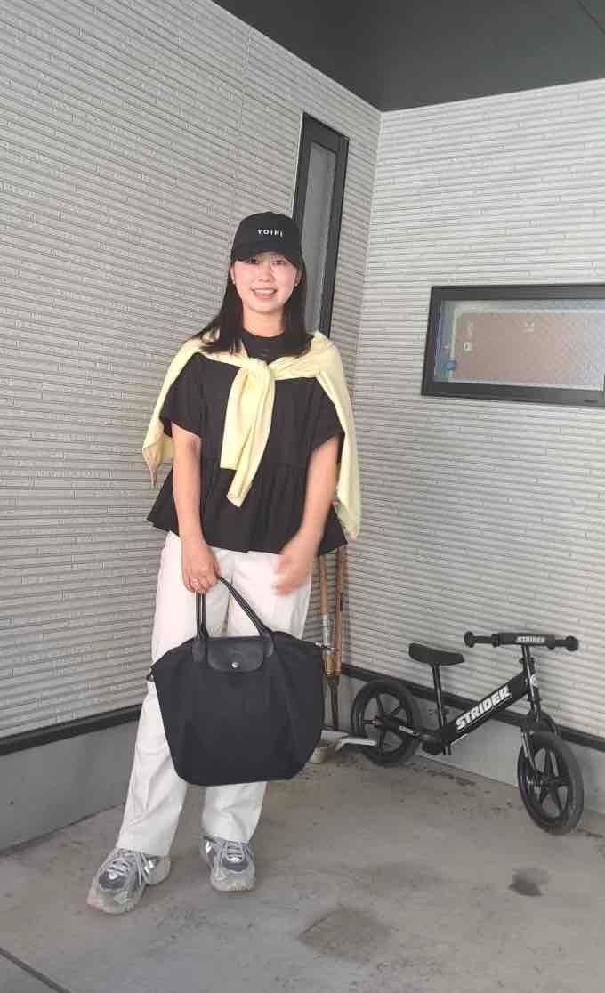 「春らしいイエローカーディガンから考え、ほかはモノトーンでまとめてバッグも黒に。下の子も同じ保育園に通っていて合同での参加予定なので、人数分の飲み物や下の子のオムツ一式、着替えとタオルを入れても余裕のある、ロンシャンのMサイズにまとめるつもりです。ベビーカーに引っ掛け、身軽で参加したいと思っています。A4も入るサイズなので復職のときに仕事用として購入しましたが、今ではマザーズバッグとしてレジャーから仕事用にも使える万能選手です」遠藤 永さん・看護師(2歳と5歳男の子ママ)