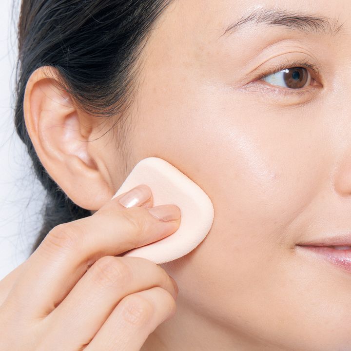 フェイスラインに向かって徐々に薄くなるように塗ったら、指に残ったもので、目や鼻、口周りなどの細部を丁寧に整えます。最後はスポンジで馴染ませて。
