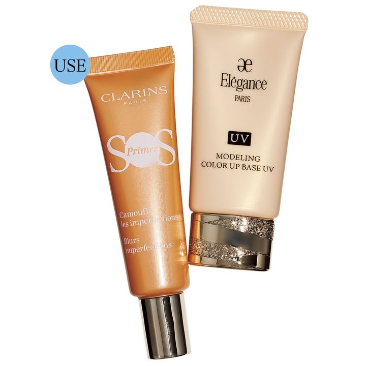 左:肌を補整するメーク効果と独自成分によるスキンケアを両立。ラディアント コントロールカラー N ピーチ 30ml ¥4,620(クラランス)〈モデル使用コスメ〉右:肌色を明るくナチュラルにコントロール。なめらかな質感で UV カット効果も。エレガンス モデリング カラーアップベース UV BE992 SPF40・PA+++ 30g ¥4,950(エレガンスコスメティックス)