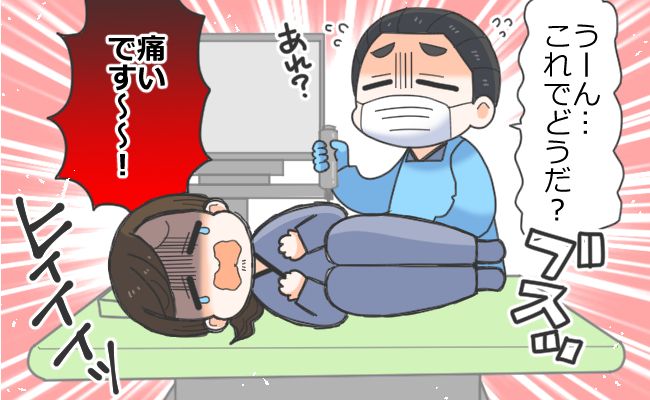 内視鏡検査を始めてすぐ、痛みに近い違和感がおなかに走ります。検査をしている先生の様子もおかしく「うーん……これでどうだ?」と何やら苦戦している模様。次第に痛みに耐えられなくなり、私は「痛いです~!」と声をあげてしまいました。先生も「そうだよね~」と言いながら、それでもうまくいきません。