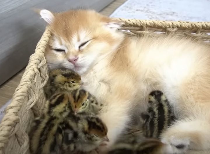 3. ママだと思われちゃった!? ヒナに好かれる子猫。