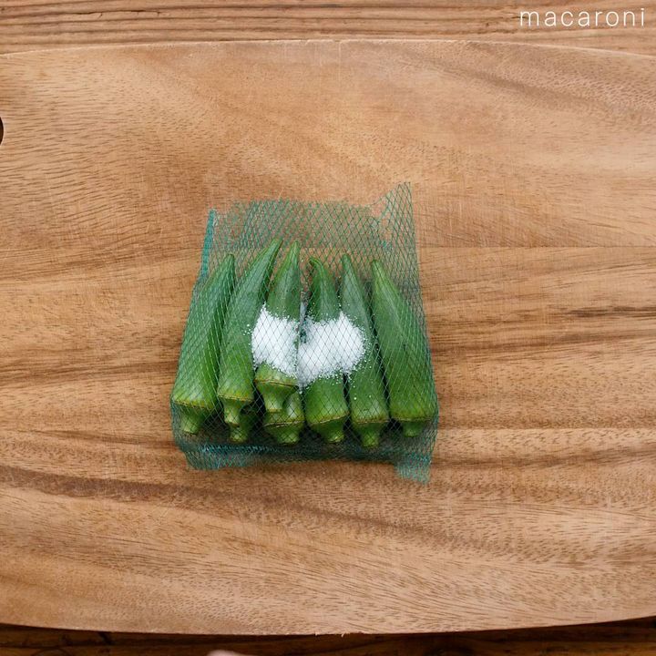 1: オクラをネットに入れたまま塩をふり、塩揉みしたら水洗いします。