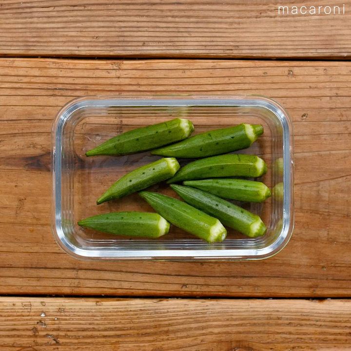 2: オクラを濡れたまま耐熱容器に移し、ガクとヘタを除きます。オクラに爪楊枝で数カ所穴を開けてラップをして、レンジ600Wで1分加熱します。