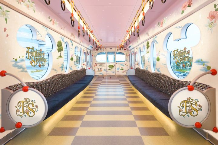 さまざまなキャラクターたちが描かれた色鮮やかな車内には「ファンタジースプリングス」の音楽も流れます。
