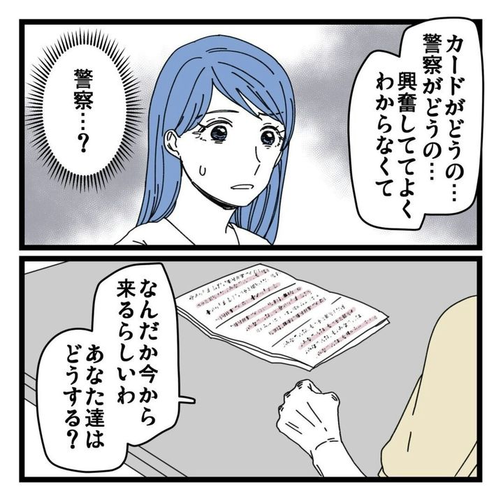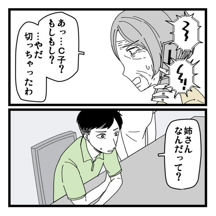 この漫画は、義母の老後資金に関する家族間トラブルを描いたものです。義母から「不自然に預金残高が減っている」と相談を受け、引き落としの履歴を調査したほぺ美さん夫婦。調べた結果、1000万円近い使途不明金がありました。その件を義母と話し合っている最中にかかってきた電話。電話の向こうは義姉でしたが、なぜか興奮し、取り乱しているようです。断片的に聞き取れた言葉の中には、「警察」という単語も含まれていたようでした。すぐに義姉もやって来ることになりましたが…。山吹いろさん(@yamabuki___iro)による作品『8桁の使途不明金』第13話をごらんください。