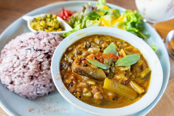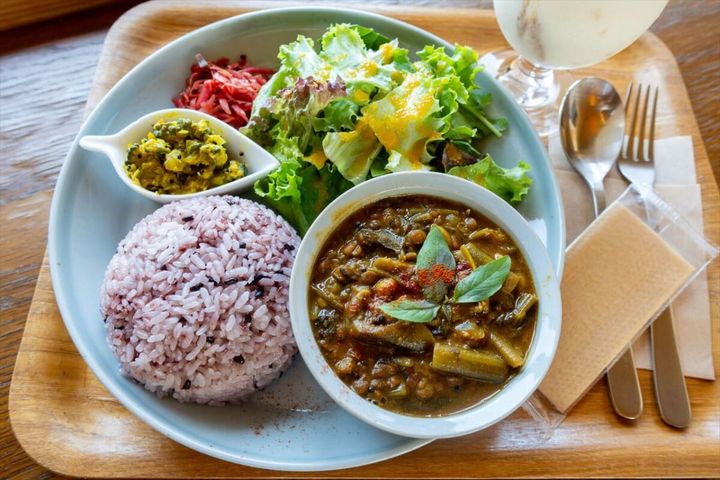 「ぬちぐさプレート」のカレーは週替わりで、写真はナスとお豆のカレーです。お惣菜やサラダも添えられ、島野菜をたっぷり味わうことができますよ。