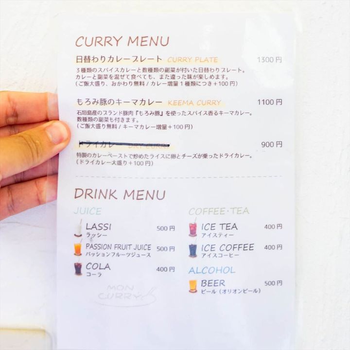石垣空港から車で約10分、石垣島白保海岸へ向かう道沿いにあるカレー屋「MON CURRY」。「日替わりプレート」は、3種類のスパイスカレーと数種類の副菜がセットになっています。島とうがらし漬けも添えられていて、辛党も満足すること間違いなし。