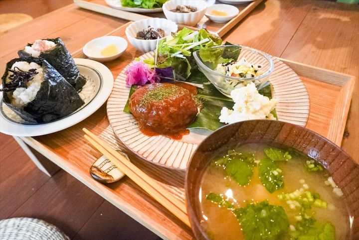 ゆったりとした琉球古民家の雰囲気が素敵なお店「niginigi」。握りたてのおにぎりや、メインのハンバーグの他にサラダや煮物などがセットになった「煮込みハンバーグランチ おにぎり2個」は、オープン当初から一番人気のメニューです。