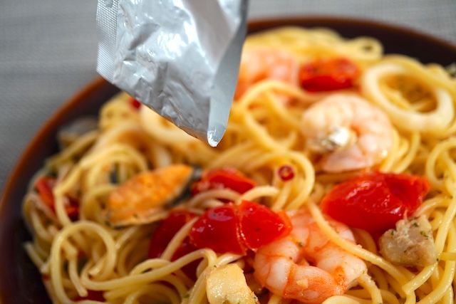 こちらは首都ローマがあるラツィオ州ゆかりのパスタ「リングイネ アッラ プッタネスカ エ ガンベリ」。600Wのレンジで8分加熱し、よく混ぜて調理します。