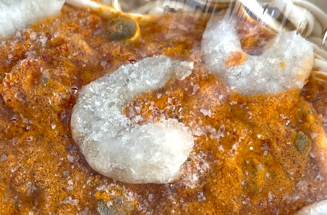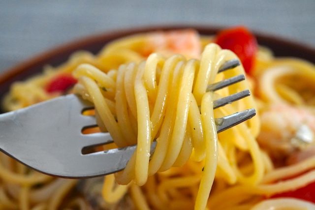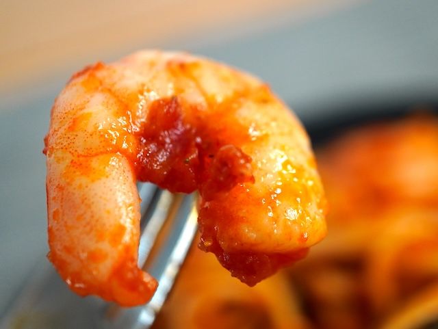 冷凍状態のパスタには生のエビが入っていましたがレンジで加熱されてちょうどいい仕上がりになっていました。しっかり身が詰まったプリプリの食感は満足感あり!