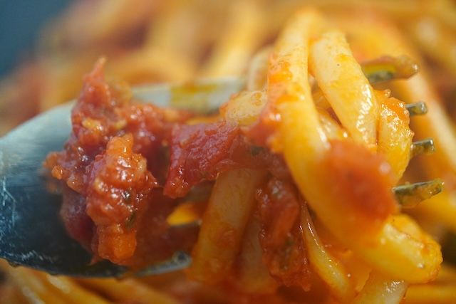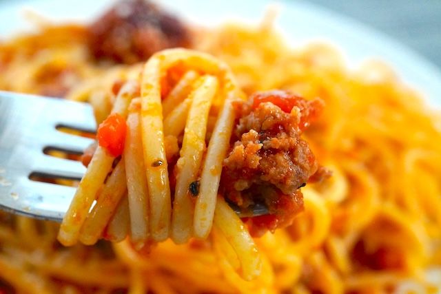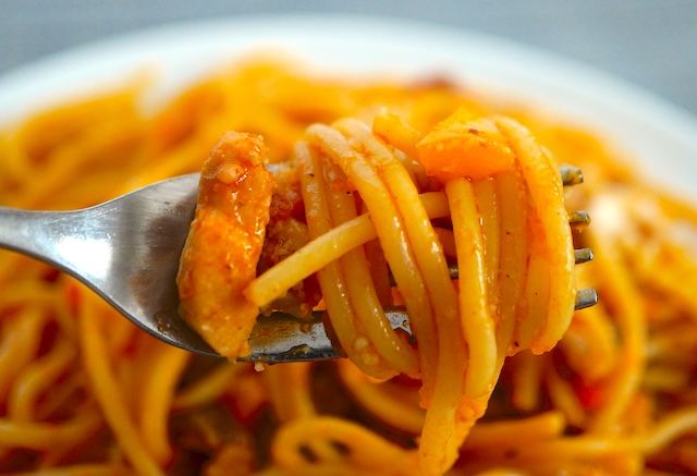 イタリア中南部のアブルッツオ州発祥の「スパゲッティ コン スーゴ アッラ テラマーナ」。600Wのレンジで8分加熱して調理します。