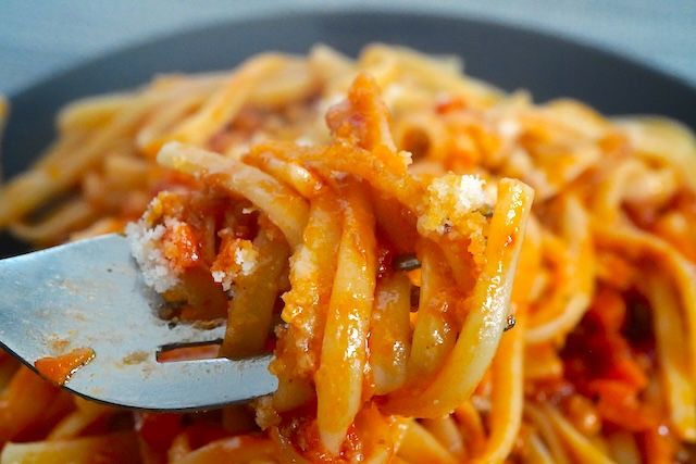 添付のパルミジャーノ・レッジャーノはたっぷりかけるのがおすすめ! 真っ赤なパスタに白いパルミジャーノがよく映えています。