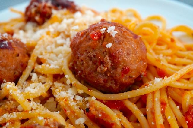 なんといっても3個のミートボールが主役! 添付のパルミジャーノ・レッジャーノをかけていただきます。
