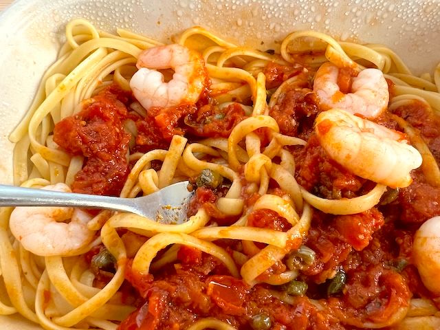 できあがったパスタはツヤツヤのオリーブとエビが贅沢なトマトソースのパスタ。