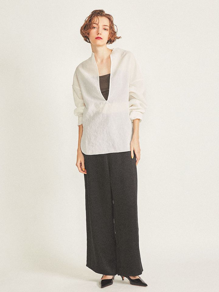 【POINT】上もゆるっとしたプルオーバーで、モノトーンを軽快に。トップスの深く入ったVネックや足元に合わせた先細パンプスなど、キレのある要素を挟んでバランスを調整。