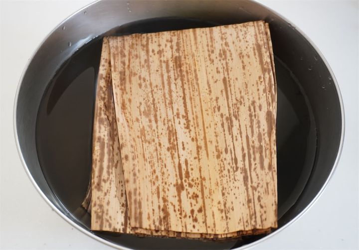 ・竹の皮は一晩水に浸してやわらかくする。