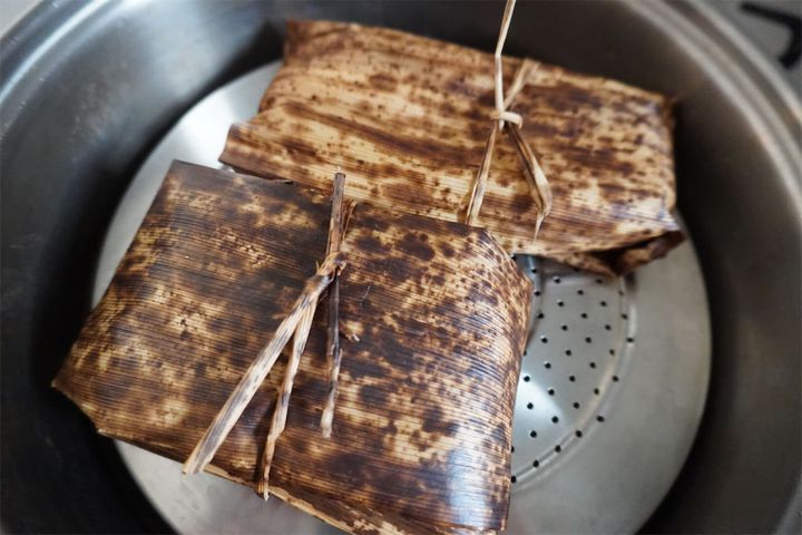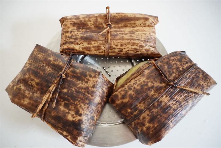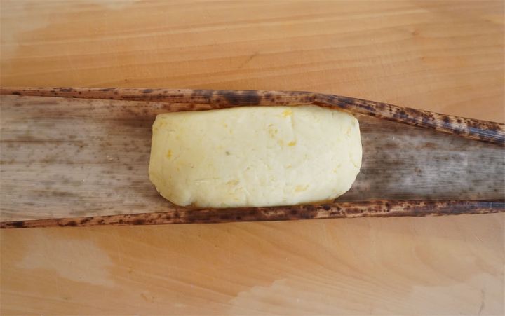3.2の生地とあんこを5等分に分ける。生地を竹の皮に伸ばし、あんこを置いて竹の皮と一緒に包み、ひもで結ぶ。