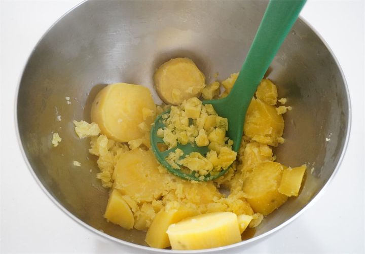 1.さつまいもは皮を剥いて適当な大きさに切り、鍋で煮て柔らかくなったらボウルに移し、マッシャーなどでつぶす。