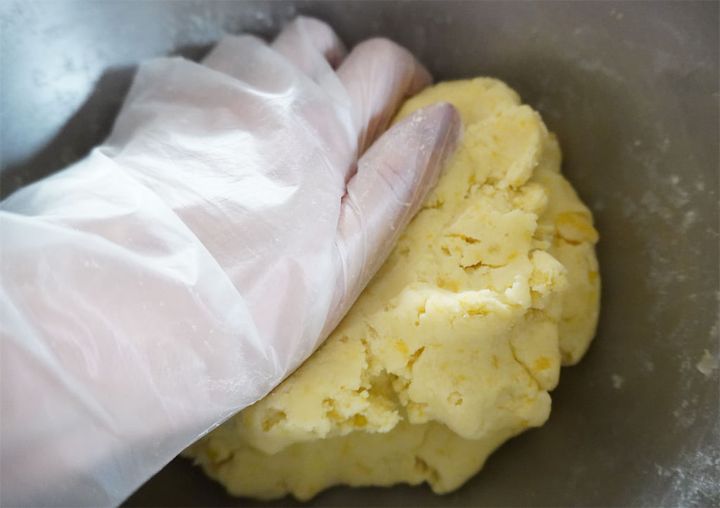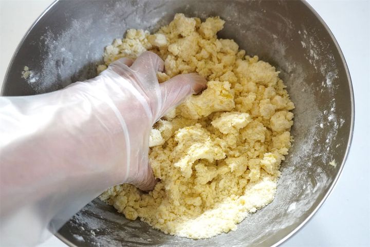 粉類が多かったり、固くてまとまらない場合は、水を少しずつ加えて調整します。