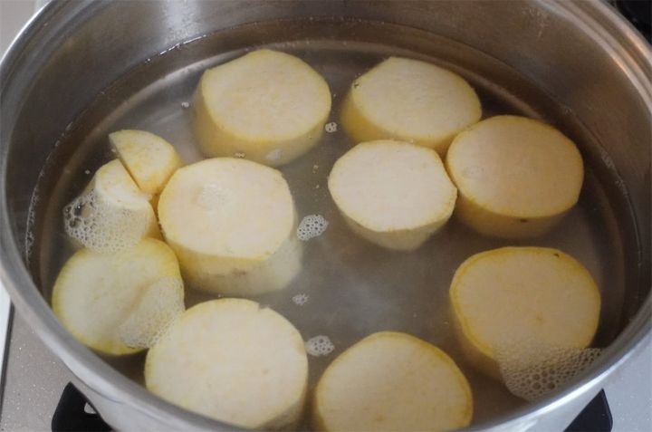 さつまいもは水から茹でます。沸騰してから10分程茹でました。