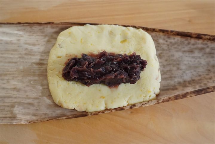 生地を平たく伸ばして真ん中にあんこを乗せます。