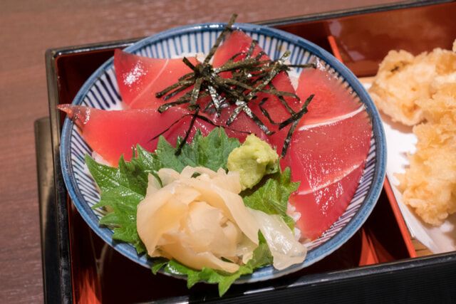 セットにはミニまぐろ丼、冷やしそば又はうどんを選び、赤だしの味噌汁がついています。色鮮やかなまぐろは特製ダレに漬け込まれ、とても美味しかったです。