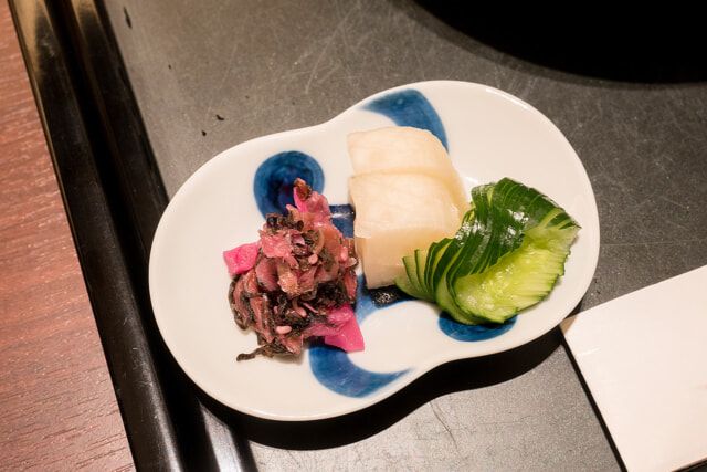 胡瓜の浅漬けはお店の手作り。軽い食感の蛇腹(じゃばら)切りで提供します。